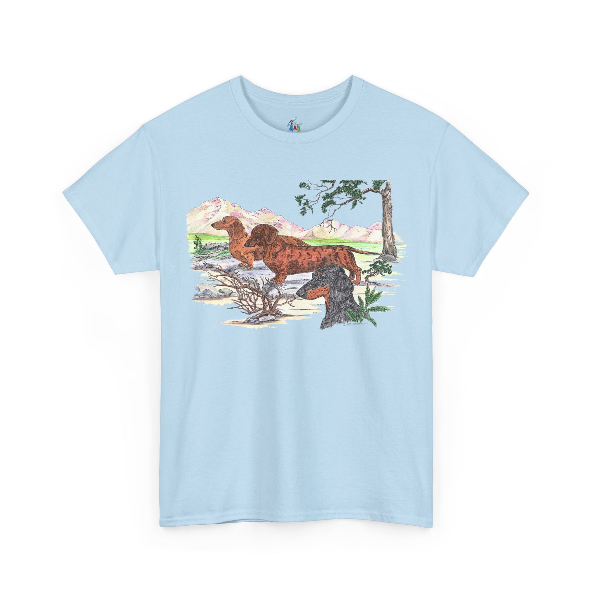 Smooth Dachshund Trio with Mountain Backdrop – Design 32-115, Dachshund Lover Shirt, Gift for Dog Moms or Dads, Casual Wear, Dog Adoption Events, Rescue Events, Pet Lover T-Shirt